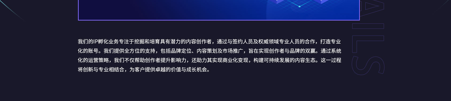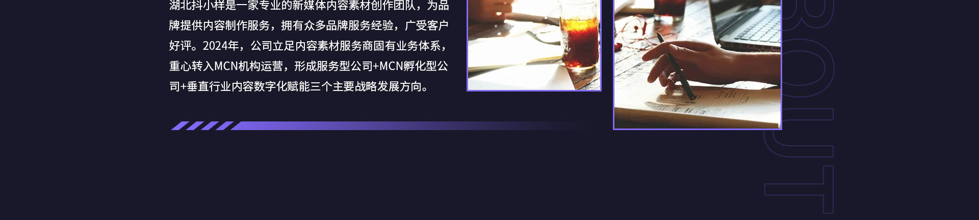湖北抖小样是一家专业的新媒体内容素材创作团队,为品 牌提供内容制作服务,拥有众多品牌服务经验,广受客户 好评。2024年,公司立足内容素材服务商固有业务体系, 重心转入MCN机构运营,形成服务型公司+MCN孵化型公 司+垂直行业内容数字化赋能三个主要战略发展方向。